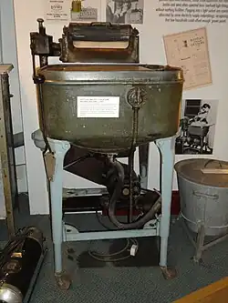| 1907 | Maytag's first washing machine, the "Pastime", was produced. F.L. Maytag decided to produce these machines during the periods of seasonally related downturns in farm-implement sales. The "Pastime" washers used a wooden tub. A dolly was turned by a hand crank via wooden pegs. This turning action would pull clothes through the water and force the clothes along the corrugated tub sides producing cleaning action. A pulley allowed the machine to be operated from an outside power source such as a tractor or a windmill. |
