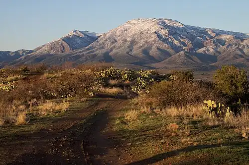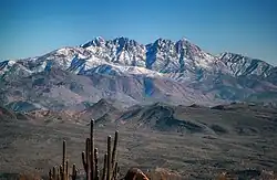 The Mazatzal Mountains (MAH-zaht-ZAL, locally Ma-tuh-ZEL) are a mountain range in south central Arizona, about 30–45 miles northeast of the Phoenix metropolitan area. The origin of the name remains obscure but one possibility is that it is from the Nahuatl language meaning "place of the deer". The crest of the Mazatzals forms the county line between Maricopa County and Gila County. SR 87, the Beeline Highway, traverses the Mazatzals on its way to Payson. The highest peak is Mazatzal Peak at 7,903 feet (2,409 m). They also include the Four Peaks, with elevation 7,659 ft, 2,334 m; a prominent mountain and landmark of the eastern Phoenix area.