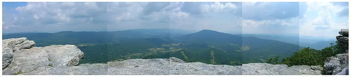 The hike is moderately difficult with a gradual incline.[8] McAfee Knob hiking trail ends on rocky mountain terrain that sticks out like a diving platform into the air.[7] The trail offers a 270-degree panorama view of the Catawba Valley. North Mountain is also viewable to the west, the Tinker Cliffs to the north and the Roanoke Valley to the east. The hike is a climb of around 1,700 feet (520 m) and about 4.7 miles (7.6 km) to the top of the Knob from the VA-311 parking area.[9]