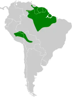 There is some confusion about the distribution of McConnell's flycatcher. All sources agree that it has a disjunct distribution. The IOC places the nominate subspecies in eastern Venezuela, the Guianas, northern and central Brazil, and northeastern Bolivia. It places M. m. peruanus solely in Peru. Clements places the nominate in eastern Venezuela, the Guianas, and northeastern Brazil north of the Amazon River. It places peruanus in Peru and adjacent southwestern Brazil and amazonus in Bolivia. Clements further states that "it is unclear whether populations of east-central Brazil south of the Amazon refer to amazonas (as these historically have been identified), or to the geographically adjacent nominate macconnelli". BirdLife International's map shows a northern population that corresponds to the IOC distribution there. The map shows a second population in Peru, Bolivia, and adjacent Brazil that corresponds with Clements' peruanus plus amazonas. The BLI account does not include subspecies.[2][7][8]
