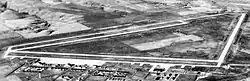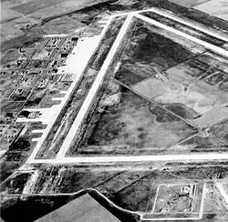 McCook AAF was one of eleven United States Army Air Forces training bases in Nebraska during World War II. The 2,100-acre (8.5 km2) base included three 150 by 7,500-foot (2,300 m) concrete runways, five hangars, and barracks for 5,000 men. It operated with three divisions: Base Services (hospital, chapel, theater, band, gymnasium, fire station, post office, photo lab, library, and military police); Maintenance and Supply (air service groups, post engineers, machine shop, warehouses); and Training (celestial navigation, gunnery and bombing, communications, radar, and aircraft maintenance). Approximately 110 buildings and structures were constructed.