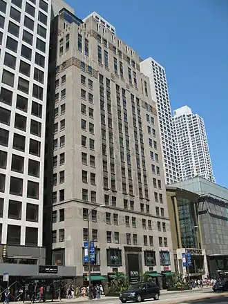 The McGraw–Hill Building was a 16-story, 190-foot-tall (58 m) landmark building in the Near North Side community area of Chicago, Illinois, at 520 N. Michigan Avenue. The facade and its architectural sculpture by Chicago-born artist Gwen Lux were designated a Chicago Landmark on February 7, 1997.[1] The building was demolished in 1998;[2] however, its facade was saved and reinstalled in 2000 on the new Le Méridien Chicago hotel building.[3] The hotel was renamed the Conrad Chicago in 2005.[4] The hotel was again renamed in 2015, becoming The Gwen, for sculptor Gwen Lux,[5] and is part of The Luxury Collection.[6] It was constructed by the McGraw-Hill Publishing Company, whose Midwestern headquarters served as the original anchor tenant.[7]