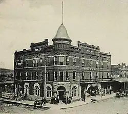 Shortly after the train of Checotah men pulled out of town, a former deputy US marshal named "General" Dunlap decided to seek out and arrest the county clerk, Edward C. Julian, who was suspected of collaborating with Jones and his raiders. Dunlap, who was reported to have been drinking before attempting to make the arrest, then headed for the hotel in the Foley Building, which is located at the same intersection the Checotah raiders had occupied. Dunlap soon found Julian's room on the third floor, but the latter was ready for any trouble.[1][2]