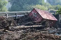 On August 2, up to 3 inches of precipitation fell over the east side of the McKinney Fire burn area, causing localized flooding and releasing large debris flows into tributaries of the Klamath River, including Humbug Creek and McKinney Creek.[43] The debris flows were significant enough to double the flow of the Klamath River in some areas from 1,000 feet per second to 2,000 feet per second for a period.[44] A private contractor working with fire crews was hospitalized with non-life-threatening injuries after flood water and debris flows caused a bridge to give out, trapping him inside his vehicle.[45][46]