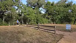 McKinney Roughs has a 17.6 mi (28.3 km) trail system that incorporates hike-and-bike and horseback riding trails.[30][56] It also has 1.44 mi (2.32 km) of shorelines that are partially developed.[31] This riverside trail is frequented among visitors who want to hike along the Colorado River.[57] There are 16 trails in total that vary in size.[58] Some trails involve rough terrain, but they are generally described as beginner friendly.[59][60] There is also a shorter route that provides wheelchair access.[60] The trails are primarily composed of dirt, unlike the limestone terrain found in many other parks in Central Texas.[59] Motor vehicles are restricted from the trails.[30][61] Visitors are allowed to bring pets on trails, but pets are required to be on a leash outside of camping grounds for their own safety and to protect wildlife.[56]