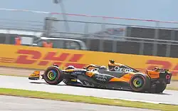 The car was raced in a special chrome livery for the United States Grand Prix.[34] McLaren also débuted a new front wing, front and rear suspension, front and rear brake ducts, and beam wing.[130] For the sprint race, Norris qualified fourth and finished third.[131][132] Piastri, who lost his qualifying lap due to a track limits violation, qualified sixteenth and improved to finish tenth in the sprint.[131][132] Norris qualified on pole and Piastri fifth for the Grand Prix.[133] Piastri finished the race fifth.[134] Norris lost several positions on the opening lap, and recovered to finish third.[134] The stewards judged that his final overtake on Verstappen, which was performed after both ran wide, meant he had gained an unfair advantage, and awarded Norris a five-second penalty that dropped him to fourth place.[135]