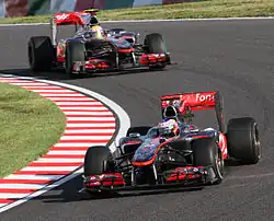 In Canada, Hamilton claimed the first non-Red Bull pole of the season, and went on to claim the Drivers' Championship lead as led home Button once again for a 1–2, giving the team the Constructors' Championship lead.[22] In Valencia, Hamilton qualified third behind the Red Bulls, with Button in seventh. In the race, Hamilton passed the safety car illegally – deployed after Webber ran into the back and over Heikki Kovalainen's Lotus – and was forced to serve a drive-through penalty. Despite this, Hamilton finished second behind Vettel with Button completing the podium.[23]
