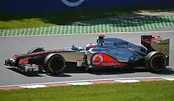 The McLaren MP4-27 is a Formula One racing car designed by Vodafone McLaren Mercedes for the 2012 Formula One season.[6] The chassis was designed by Paddy Lowe, Neil Oatley, Tim Goss, Andrew Bailey and John Iley and was powered by a customer Mercedes-Benz engine. The car was driven by former World Champions Jenson Button and Lewis Hamilton. It was launched on 1 February at the McLaren team base in Woking, Surrey, ahead of the first winter test sessions at Jerez de la Frontera.[1][7] This was the last McLaren car that Lewis Hamilton drove for the team, as he moved to the Mercedes AMG Petronas F1 Team in 2013. This was also the last McLaren Formula One car to win a race until the McLaren MCL35M did so in 2021 and the last to win more than one Grand Prix in a season until the MCL38 of 2024.
