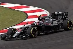 The McLaren MP4-31 is a Formula One racing car designed by McLaren to compete in the 2016 Formula One season. The car was driven by 2005 and 2006 World Drivers' Champion Fernando Alonso and 2009 World Champion Jenson Button, and reserve driver Stoffel Vandoorne, who replaced Alonso at the Bahrain Grand Prix following the Spaniard's accident at the Australian Grand Prix which deemed him unfit for the next event.[2]