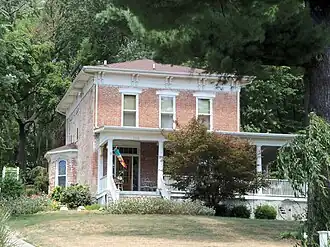 This house exemplifies the combination of the Italianate and the Greek Revival styles that were popular in Davenport in the mid-19th century.[2] The two-story house is built of brick and is three bays wide with a doorway in the left bay. The simple bracketed cornice that rings the top of the house, and the low hipped roof evoke the Italianate style. The Greek Revival style is found in the simple window pediments and the wide, glass framed doorway.[3] A porch wraps around the front of the house to the east side. It was built 40 to 50 years after the house and adds the Neoclassical style to the house.[2]