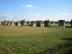 Tower-like sand bins covered in greenery as designed by Frederick Law Olmsted Jr.