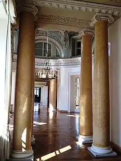The facade to the front has a portico with four columns, the part to the park has a semi-rotunda that both correspond to the design by Giacomo Quarenghi. The bel étage is located on the first floor, which can be accessed by a staircase that was built in the second half of the 19th century. The domed main hall stretches over two storeys, which was also designed by Giacomo Quarenghi. The main hall is in the centre of the house, on either sides are various salons and the dining room. The hall is built in the neoclassical style and the space was influenced by the Pantheon in Rome. The third floor was used as living quarters and guest rooms. The interior used to be filled with paintings, sculptures, porcelain and furniture.