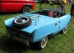 Commencing around July 1956, in a back room at the Meadows factory,[10] a prototype vehicle nicknamed The Bug was constructed and developed.[2] This small, four-wheeled, two-seater had a moulded fibreglass shell with gull-wing doors and a Villiers air-cooled 250 cc (15 cu in) two-cylinder engine fitted to a brazed ladder-type chassis. To make a differential unnecessary, the car had a narrow rear track, with drive to the solid rear axle by roller chain. The car was fitted with a four-speed motorcycle manual gearbox, with reverse obtained by running the engine backwards through the Dynastart unit.[11]