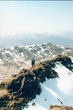 Regarding the other peaks in the Tarmachan ridge, Meal Garbh (translates to "rough lump"[2]) and Beinn nan Eachan ("mountain of horses"[2]) are classified as munro tops due to lack of sufficient separation.[3] Creag na Caillich ("crag of the old woman"[2]) does not qualify as a munro top (despite previous inclusions to the list) as it is 2999.7ft tall, 0.3 ft under the 3000ft criteria.[4]