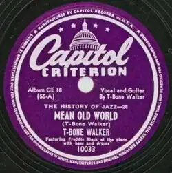 T-Bone Walker began performing "Mean Old World" when he was with Les Hite and His Orchestra from 1939 to 1940.[3] After leaving Hite's band, Walker continued to develop and refine his style on the Los Angeles club circuit. On July 20, 1942, he recorded "Mean Old World" for Capitol Records.[4] The song was performed in the West Coast blues style, with a small combo of pianist Freddie Slack, bassist Jud DeNaut, and drummer Dave Coleman accompanying Walker on vocal and guitar. "Mean Old World" "showcased T-Bones's new, and already developed, style, in which he answered his smoky, soulful vocal phrases with deft, stinging, jazz-inflected lead lines on his electric guitar".[2] Capitol released the song in November 1945, with "I Got a Break, Baby", as the third disc in a five 10-inch record collection "The History of Jazz, Volume 3: Then Came Swing" (Capitol Criterion CE 18).[5] Capitol later issued it as a single in 1947 (Capitol 15003).