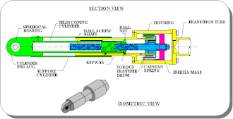 The image at right shows an isometric view of one style of mechanical snubber. When a disturbance occurs that exceeds the acceleration threshold of the snubber, the ball screw and drum produce angular momentum to the inertia mass. The inertial resistance of the mass engages the resilient capstan to tighten around a hardened mandrel, which is part of the structural tube. This, in turn, causes restraining force against the rotation of the ball screw. During standard operation, the associated acceleration is far below the threshold limit of the snubber and will not activate the capstan spring.[4]