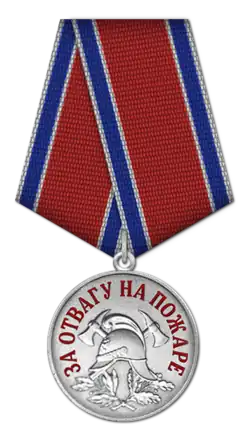 Medal "For Bravery in Firefighting" (Russian: Медаль «За отвагу на пожаре») is a state award of the Russian Federation. Established by Decree of the President of the Russian Federation dated September 15, 2018 No. 519 “On the establishment of the medal "For Courage in Fire" and the establishment of the honorary title "Honored Firefighter of the Russian Federation".[1][2]