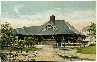 By 1875, an intermediate station - East Medford - had been added at Spring Street.[5] A second stop at Park Street was added by 1889.[6] The East Medford station had been renamed Glenwood by then, and was relocated slightly to the east by 1900.[7][8]