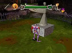 The game takes place across a variety of levels, many of which require certain objectives to be performed to progress. Sir Daniel Fortesque can use a variety of weapons, consisting of close range weapons such as swords and clubs to long range weapons such as crossbows.[2] Many can be charged for a powerful attack and some, such as the club, can be used to access areas that are otherwise inaccessible. When not possessing any items, Dan is able to rip his arm off and use it for both melee and ranged attacks.[3] Dan can equip a shield alongside weapons for defence, but each type of shield has a limited amount of strength and are therefore best used sparingly. Throughout the game, Dan can visit gargoyle heads of two varieties: green ones offer Dan information while blue ones allow Dan to buy services or ammunition by using the treasures he finds.