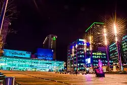 Traditional street names are not used in the development; instead, the main thoroughfares are styled blue, white, pink, yellow, orange, purple and green, with street furniture and ambient lighting colour-coded to match. A stylised map of the site has been devised. Landscape architects Gillespies regenerated the brownfield site to create public spaces.[28] The focal point is a piazza and landscaped park, around which the buildings are located. The piazza's two distinct areas, The Green and The Stage, have the capacity to hold events for up to 6,500 people.[29] A free-standing big screen, in front of The Studios, is viewable from the piazza.[30]