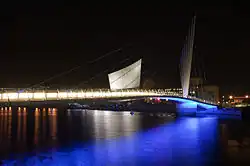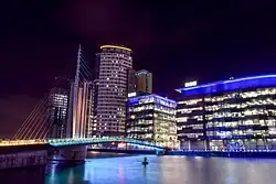 The Media City Footbridge is a swing-mechanism footbridge over the Manchester Ship Canal near MediaCityUK. It is an asymmetric cable-stayed swing bridge and was completed in 2011.[2] It was designed by Gifford (now part of Ramboll) and WilkinsonEyre.[3]