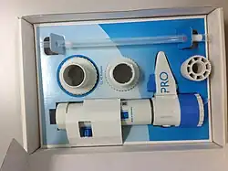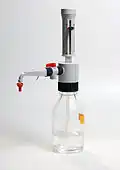 A bottle top media dispensers is an inexpensive alternative to the motor-driven inductive pump. This type involves a piston on a plunger which is pushed down against a spring: as the spring pushes the piston back into its original position, it draws the medium up from a reservoir underneath. When pushed down again, plunger infuses the medium out the dispenser tip. Like the electrical model mentioned above, the bottle top dispenser has no gaskets or seals. Unlike the previous model, this one requires no electricity. However, it is limited in the total amount of medium it can dispense before the source bottle requires a refill, making it convenient for small applications but less so for larger. They are also more difficult to calibrate than the pipettes.[2]