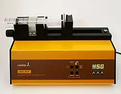 A syringe pump consists of one or more syringes which have been pre-filled and loaded into a mechanized device containing a motor-driven lead screw which will push the reciprocating plunger of the syringe(s) for specified distances at specified intervals. These devices are capable of extremely high accuracy and are pulse-free (i.e., the fluid is dispensed in a continuous stream rather than with the pulsations of the peristaltic or inductive pumps) but are limited in volume to the total volume of the attached syringe(s), and, once the emptied, the syringe(s) will require refilling before being used again making them of even more limited use than the bottle top dispensers. They are also among the most expensive types of media dispensers currently on the market. Common syringe pump media are acids, chemicals, coolants, combustible fluids, corrosive agents, gasoline or diesel fuel, non-liquid gas or air, ground water, hazardous materials, high viscosity fluids, liquid metal, oils, potable water, salt water, adhesives, and high temperature media.