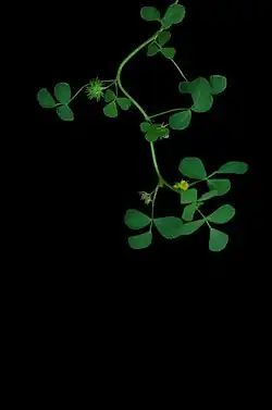 Medicago truncatula, the barrelclover,[2] strong-spined medick,[3] barrel medic, or barrel medick, is a small annual legume native to the Mediterranean region that is used in genomic research. It is a low-growing, clover-like plant 10–60 centimetres (3.9–23.6 in) tall with trifoliate leaves. Each leaflet is rounded, 1–2 centimetres (0.39–0.79 in) long, often with a dark spot in the center. The flowers are yellow, produced singly or in a small inflorescence of two to five together; the fruit is a small, spiny pod.
