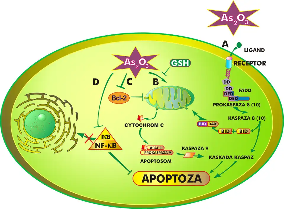 Arsenic trioxide also affects the intracellular concentration of glutathione, which is a crucial component of the redox system (it removes radicals and reduces hydrogen peroxide). It also participates, along with peroxidase and catalase, in regulating the levels of reactive oxygen species.[54] Arsenic trioxide inhibits glutathione peroxidase, thereby decreasing its concentration in the cell, which leads to an increase in the levels of reactive oxygen species.[55] These, in turn, increase the permeability of the mitochondrial membrane, causing the release of apoptotic factors and initiating the apoptosis process.[56]