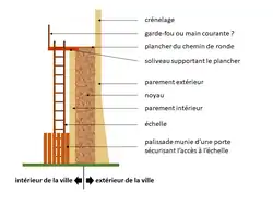 The foundations, when present, appear to be constructed from reused limestone rubble placed into a trench without using mortar.[T 5][14] The curtain wall is composed of two facing layers of regular limestone rubble, held together by mortar, with an irregular rubble core bonded with either mortar or clay.[T 6][14] The wall is approximately two meters in thickness at its base, and the lower portion of its external surface exhibits a distinct batter.[14] The structure stands at a height of 11.7 meters (approximately six toises), though this measurement may include the foundations, as observations indicate an elevation of 6 to 8 meters above ground, varying by region.[G 3] The wall is equipped with crenellations at its summit, which may have initially included wooden battlements.[13] It also incorporates a wooden walkway constructed in an overhanging style.[T 7] This walkway was likely accessed via ladders, which were used to safeguard[T 8] the guards from assault and to deter them from abandoning their posts, as desertions were prevalent.[C59 2]