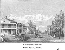 Most early residents were farmers. In the 1830s, the community's growth was aided by the completion of the Ohio and Erie Canal, which helped transport agricultural products to markets.[7] On January 31, 1835, Medina was incorporated as a village and as the county seat of Medina County.[7] By 1855, the town's quarries were producing over $200,000 worth of stone per year.[8] In 1857, many of the canal workers started a strike for higher wages; the striking workers were fired, and the four workers who started it were jailed in Albion, Ohio.[9]