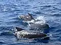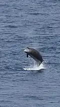 The False killer whale (Pseudorca crassidens) is the 3rd largest species in the delphinid family, with a length of up to six meters, a black coat and rounded head reminiscent of pilot whales, but a more elongated body, an almost melon-less head and a larger mouth. Its behavior is also more energetic. In the Mediterranean, this species seems to be represented only by a small population in the eastern basin, very rarely observed and about which little is known.[12] A few isolated sightings do occur in the western basin, but it remains difficult to determine whether this is a resident population or temporary visitors from the Atlantic.[13]