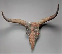 In the archaeological record, a culture known as the Pan-Grave culture[13] is generally considered by experts to represent the Medjay.[14][15] This culture is named for its distinctive circular graves, found throughout Lower Nubia and Upper Egypt, which date to the late Middle Kingdom and Second Intermediate Period (1800-1550 BC).[14][15] The sudden appearance of these graves in the Nile Valley suggests that they represent an immigrant population, while the presence of Nerita shells in many of them suggests their occupants came from the Eastern Desert between the Nile and the Red Sea.[14] Other objects commonly found in these graves include the painted skulls of various horned animals, which are found either arranged in a circle around the burial pit or placed in separate offering pits.[14]