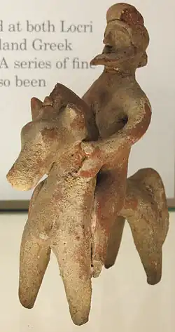 A pair of terracotta altars from Medma with the myth of Aphrodite and Adonis dating back to the 4th century BC was probably stolen in the early 20th century and is now exhibited at the J. Paul Getty Museum of Los Angeles.[6][7][8]