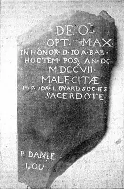 - ^ Latin inscription: "To God, most excellent, most high, in honor of Saint John Baptist, the Wolastoqiyik erected this church A. D. 1717, while Jean Loyard, a priest of the Society of Jesus, was procurator of the mission." (See Raymond, P.9)