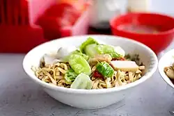Bak chor mee (simplified Chinese: 肉脞面; traditional Chinese: 肉脞麵; pinyin: ròucuǒ miàn; Pe̍h-ōe-jī: bah-chhò-mī; Teochew: neg8 co3 mi7; Southern Min: bak chor mee), which translates to minced meat noodles, is a Singaporean noodle dish popularly sold as street food in hawker centers and food courts.[1] The noodles are tossed in vinegar, minced meat, pork slices, pork liver, stewed sliced mushrooms, meat balls and bits of deep-fried lard. Bak chor mee can be categorised into two variants: a dry version and a soup version. Most dry versions come with slices of stewed mushroom, minced pork, slices of lean pork and sometimes fried ikan bilis, atop noodles tossed in a punchy chilli-vinegar sauce, while soup versions are lauded for the depth of pork flavour in its broth. Singapore's bak chor mee was listed as the top world street food by World Street Food Congress. [2]