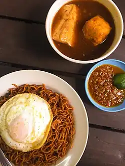 ![]() A bowl of kuah mee tauhu (taucu gravy) (right), accompanied by sambal (bottom), alongside a plate of mee goreng topped with ayam goreng and a fried egg. | |