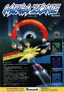 Mega Zone is an overhead vertically scrolling shooter released as an arcade video game by Konami in 1983. Mega Zone is similar to Xevious, where the player flies over a landscape of rivers and trees and futuristic enemy emplacements. There are both aerial and ground targets, but unlike Xevious both can be destroyed with the same weapon. At certain points the player can choose either the left or right fork of a branching path.[4]