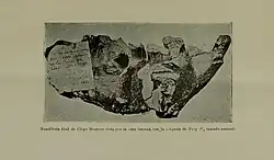 Megalocnus was first described based on an incomplete mandible first described by "D. M. F. de Castro", collected by him in April 1860 in Pleistocene deposits of the thermal springs in Arriete-Ciego Montero in what is now Cienfuegos Province, Cuba; the fossil is held in the Museo Nacional de Ciencias Naturales.[1][5][6] It was first identified as the mandible of a large rodent due to the erosion on the canines.[5] The mandible was then given to Prof. Felipe Poey of Havana, who described it briefly in 1861. The fossil was named in 1868 when American paleontologist Joseph Leidy described it as a new species of the large Megalonyx, Megalonyx rodens, though stated that it could be a different genus, which he erected as Megalocnus.[5] A few months later, Parisian naturalist Pomel was sent the fossil by Poey for the 1867 Parisian exposition, who named it as Myomorphus cubensis, subgenus of Megalonyx. Despite this, Megalocnus rodens has priority. In the coming years, more fossil sloths would be named from the Caribbean based on fossils from Puerto Rico and Hispaniola, but it wasn't until the 1910s that a large quantity of fossils of Megalocnus were found.[7] The American Museum of Natural History and the notable Cuban scientist Carlos de la Torre y Huerta collected dozens of fossils of many partial skeletons from 1910 to 1918 at Arriete-Ciego Montero, which resulted in the discovery of enough fossils to mount 3 different skeletons for the AMNH, though only 2 are mounted today at the AMNH, and a skeleton for the Cuban Museum of Natural History.[6] Dr. de la Torre was apparently so fond of his mounted skeleton that he would exhibit it at nearly every exhibition he could.[6] One of the skeletons mounted at the AMNH has since been revealed to bear the right femur of the closely related Parocnus browni.[6] The fossils would be described in detail by both AMNH and Cuban staff over the next 50 years.[8][9][1]