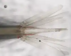 Similar to all krill species, northern krill are crustaceans that possess a transparent chitinous exoskeleton. Northern krill can grow up to 4-6 centimeters long in adult hood, although on average they are 1.5–2 centimeters.[3] Their anatomy is a decapod consisting of three main sections: the cephalothorax, the abdomen, and the tail fan. The cephalothorax is the krill's head which houses two antenna and compound eyes. Northern krill utilize their antenna to sense their surroundings and aiding in eating feed. In addition to the northern krill's antenna they also have maxillipeds which aid them in handling food to their mandible.[4] Found in insects, krill also operate through compound eyes which allows them to see a large array of area, detect rapid movement, and see in deep sea light conditions.[5] Northern krill also possess mandibles and maxillipeds which aid them in eating