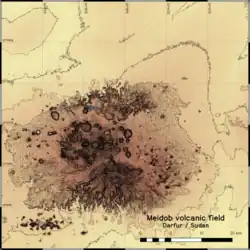 The Meidob volcanic field lies in northern Darfur[5] and is part of northern Sudan.[6] The towns of Bir Harra, Ein Basoro and Malha are near the volcanic field,[7] while El Fasher is 220 kilometres (140 mi) south-southwest from it.[8] The Meidob volcanic field is one among several volcanic fields in northern Africa, such as Al-Haruj, Cameroon Line, Hoggar, Jebel Marra and Tibesti,[9] some of which are considered to be part of a northeast-trending volcanic province.[10]