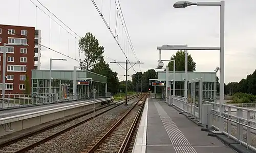 In May 2010 construction of Meijersplein station completed and Wilgenplas station was duly closed down on 12 May. Meijersplein station was opened on 17 May and it is now being served by metro trains of line E. It has an Airport Shuttle service to and from Rotterdam The Hague Airport.[2] In 2020 a tender was issued for autonomous vehicles for this shuttle service.[3]