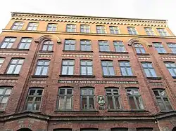 Smedeforeningens Stiftelse/No. 17 is from 1883 and was built to provide affordable housing for master smiths in difficult circumstances. The facade features a plaque with a bronze relief portrait of the association's president, A. W. Holm, an anchor smith.[1]