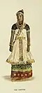 In the days of monarchy, unless permitted by the kings, various articles of dress and ornament could not be worn by commoners, and permission to wear any of these articles was much coveted. Persons of high rank were permitted to have carried before them a red woollen cloth; of a less rank, a green woollen cloth; and of a less still, a cloth of cotton manufacture. These they used as rugs to sit on, and it was only for such use they were prized; as articles of dress they might be used by any who could afford to buy them. Women were not allowed to wear clothes embroidered with gold either in the presence of the kings or elsewhere without permission. Descendants of the kings were not bound by this restriction.[1]