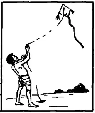Children fly Telanga kites (ꯇꯦꯂꯪꯒꯥ / ꯇꯦꯂꯡꯒꯥ) by holding the string and running to generate wind lift, allowing the Telanga to ascend into the air.[14] They control the Telanga's movement by adjusting the tension on the string, guiding its direction through shifts in the wind. This activity often takes place in open areas where wind conditions are suitable for Telanga flying.[2]