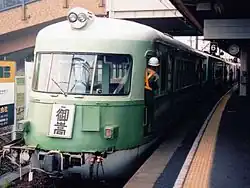 The initial six cars from 1937 was refurbished between 1967 and 1968.[17][16] All cars were painted scarlet in 1976.[18] After the establishment of Central Japan Railway Company (JR Central) from the privatization of Japanese National Railways, JR Central began to improve the service frequency and increase the convenience of the Tōkaidō Main Line, which partially ran alongside Meitetsu Nagoya Main Line. Meitetsu introduced the 6500 series and 6800 series from 1987 to 1989 to compete,[19] rendering the older rolling stock obsolete.[20] Two sets were scrapped in 1988, and the remaining set 3403 was reduced to two cars. The set 3403 was renumbered to set 3401. Although the new set 3401 was planned to be scrapped some years later, it was awarded the Evergreen Award in 1993 by the Japan Railfan Club, which is given to trains that have served a long time. Meitetsu decided to preserve the new set 3401 and repaint the set back to its original livery following this award.[20] However, no colored images of the old 3400 series back in the day existed forcing the company to ask people who remember it. The lower half of the set was painted green, while the upper half was painted light green.[21] The repainted new set 3401 was first used in a reserved train between Higashi Okazaki and Kō Station for the award ceremony of the Evergreen Award.[22] Air conditioners were installed in 1994 to maintain service standards.[20] 1994 was also the 100th year since the formation of Meitetsu, and the new set 3401 was temporarily ran for a rapid service between Hekinan and Yatomi to celebrate it for the entirety of August that year.[23]