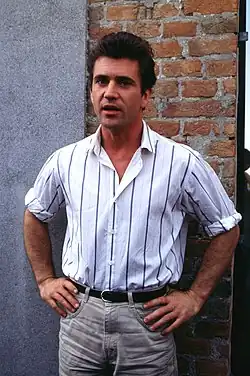 Gibson's first American film was Mark Rydell's drama The River (1984), in which he and Sissy Spacek played struggling Tennessee farmers. Gibson then starred in the Gothic romance Mrs. Soffel (also 1984) for Australian director Gillian Armstrong. He and Matthew Modine played condemned convict brothers opposite Diane Keaton as the warden's wife who visits them to read the Bible. In 1985, after working on four films in a row, Gibson took almost two years off at his Australian cattle station.[31] He returned to play the role of Martin Riggs in Lethal Weapon (1987), a film which helped to cement his status as a Hollywood "leading man".[32] Gibson's next film was Robert Towne's Tequila Sunrise (1988), followed by Lethal Weapon 2 (1989). Gibson next starred in three films back-to-back, all released in 1990: Bird on a Wire, Air America, and Hamlet.