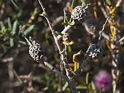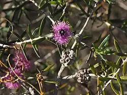 The flowers are a shade of pink to purple and arranged in heads or short spikes on the ends of branches which continue to grow after flowering, sometimes also in the upper leaf axils. The heads are up to 15 mm (0.6 in) in diameter and contain between 5 and 12 groups of flowers in threes. The stamens are arranged in bundles of five around the flower, with 4 to 7 stamens in each bundle. The flowering season is September and October and is followed by fruit which are woody capsules, 2–3.5 mm (0.08–0.1 in) long in an almost spherical cluster around the stems.[2][3]