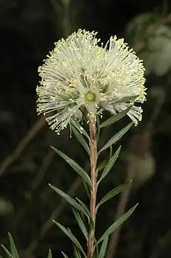The flowers are cream-colored and grouped in a short spike or a head at the ends of the branches which continue to grow after flowering. Each head contains 3 to 15 flowers and can be as large as 35 mm (1 in) in diameter. The stamens are arranged in five bundles around the flower and there are 15 to 33 stamens in each bundle. Flowering occurs between October and December and is followed by fruit which are woody capsules. These are spherical to urn-shaped, about 5–7 mm (0.2–0.3 in) long and arranged in loose clusters along the stem.[2][3][4][5]