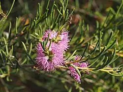 Melaleuca ctenoides is a shrub in the myrtle family, Myrtaceae and is endemic to the south-west of Western Australia. It was first described in 1990 in a review of the genus Melaleuca when the species M. laxiflora at that time was found to comprise ten species. Two of those species were new - M. camptoclada and M. ctenoides.[2] It similar to Melaleuca laxiflora but distinguished from it by its comb-like leaves and attractive mauve or violet flowers in spring.
